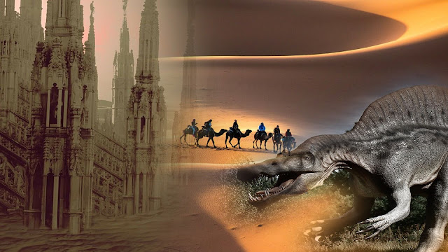 - لطالما كانت البحار موطناً للوحوش , ومنذ حوالي 120 مليون عام , كانت الصحراء الكبرى موطناً لتمساح يُعرف بـ المكيموسوروس , والذي بلغ طوله حوالي 9 أمتار , وهو أكبر تمساح محيطي معروف حتى الآن , ويعتقد العلماء أن المنطقة التي عاش فيها هذا التمساح ربما كانت بحيرة شاسعة امتدت إلى بحر التيثس وهو البحر القديم الذي كان يفصل بين القارات خلال العصور المختلفة من عمر الأرض، وهو غير ثابت الموقع إذ أن موقعه كان يتغير تبعاً لحركة القارات .استخدم هذا النوع من التماسيح رأسه الضخم , وقوة عضته المذهلة , وأسنانه الوحشية القصيرة لكسر أصداف السلاحف البحرية وصيد الأسماك .8- السبينوصور - Spinosaurus