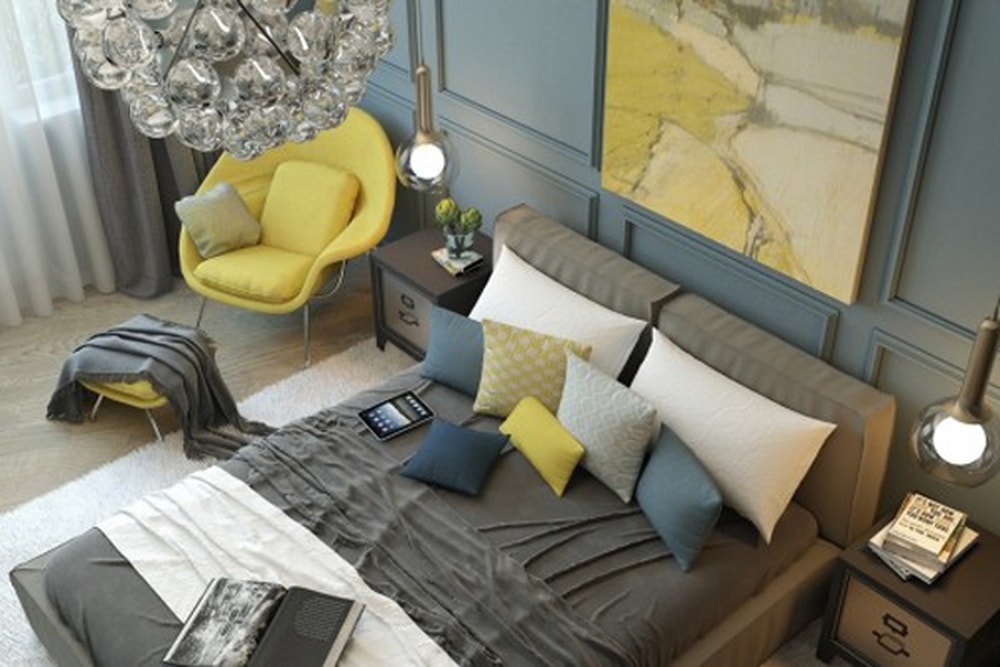 تنويعات اللون الأصفر زادت من هذا التصميم إشراقةً وجمالاً لاسيما مع الأرضية الخشبية الأنيقة والتي تتسق تماماً مع جميع