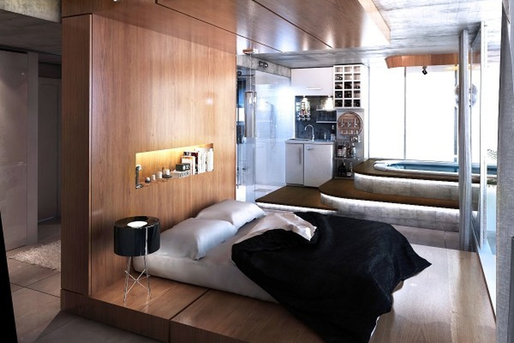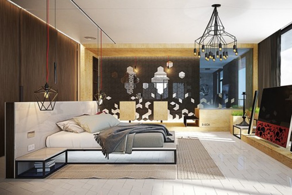 تصميم فخم من إبداعات المصمم: Sergey Procopchuk غرفة شديدة الرحابة تم تصميم السرير والكومود كقطعة واحدة منبثقة من الحائط الخلفي لها وكما يظهر في التصميم وفي معظم التصميمات السابقة أن السرير دائما في مستوى منخفض لأن هذا علمياً أكثر راحة وحميمية.