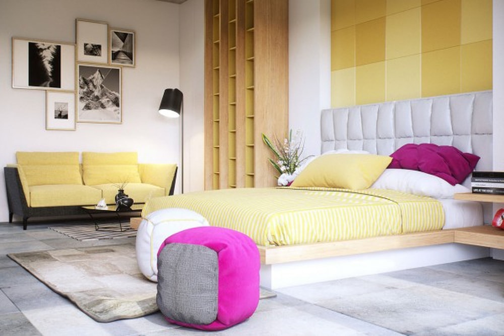 تنويعاً أخر للون الأصفر مع الأبيض لكن هذه المرة تم إضافة اللون الفوشيا أو البينك الداكن مما زاد التصميم مرحاً وحيوية أكثر وزاده إشراقاً مع اللون الأصفر , لاحظي أيضا خلفية السرير المبطنة والمنجدة وهو من مجموعة تصميمات: Image Box Studios