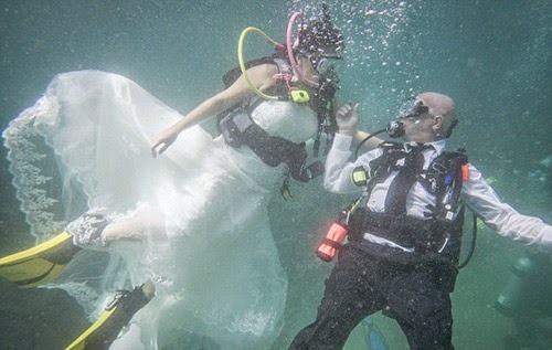 <a name=\'more\'></a>وقد أجريت مراسم الزواج بحضور قس من الكنيسة و 20 شخصا من أصدقائهم وأقاربهم، مرتدين بدل الغوص وأنابيب الأكسجين, وأوضحت ليزابيث، وهي منظمة الحفل الرئيسية، أنهما عقدا
