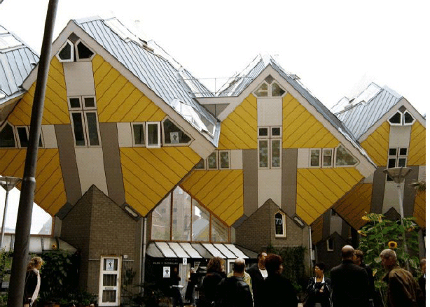 Cubic Housesأو البيوت المكعبة هي من تصميم المهندس المعماري بييت بلوم، تم بنائها في العام 1984 ... وقد تم اختيار موقعها في نقطة التقاء عدة طرق للمشاة في وسطمدينة روتردام الهولندية... هذا البناء مكون من 32 بيتاً مكعباً مستقلاً... كل بيت مقسم إلى ثلاثة طوابق، الطابق الأول لقضاء النهار والثاني لقضاء الليل... في حين يشكل الثالث مساحة إضافية يمكن استخدامها وفق الحاجة