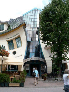 البيت الأعوج Crooked House يقع في المنطقة التجارية في مدينة سوبوت البولندية وقد صممه المهندس زوتينسكي زاليسكي الذي كان ملهمه الفنان البولندي جان مارسين تزانسير صاحب الرسومات والقصص الخيالية الخاصة بالأطفال... المبنى في الصورة يبدو بالفعل وكأنه قد جاء من حكايات الأطفال، وهو في الواقع مركز كبير للتسوق