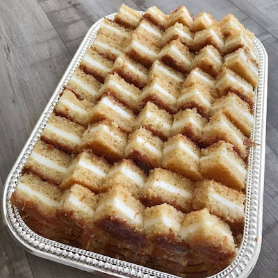 ونخلط شوي ماء مع خليط البسبوسه الباقي ونصبه على الحشوة ثم نضع شعريه مكسره وندخلها الفرن ونضعها تحت مرا ونشغل عليها من فوق فقط ليما تستوي ثم نسقيها شيره او نستله وبالف عافيه مقاس الصينيه صغير ٢٠ سم