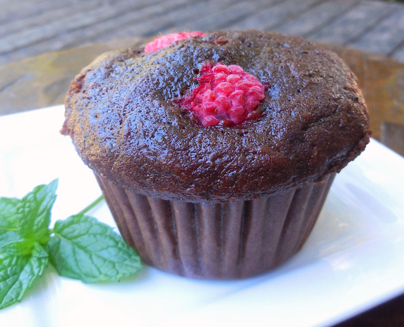 At last — the perfect place for that one zucchini you can’t get rid of. It’s a bit sneaky, I know, hiding it in a chocolate muffin, but why not? Add fresh raspberries, too, and you have a seasonal snack that doubles as dessert or the perfect picnic take along. The flavor of these moist muffins improves overnight, so make them ahead, wrap in plastic, and store at room temp or freeze.