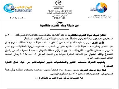 أرسلت شركة مياه الشرب والصرف الصحي بالقاهرة لخدمة «صحافة مواطن بوابة أخبار اليوم»، بيان بتسع