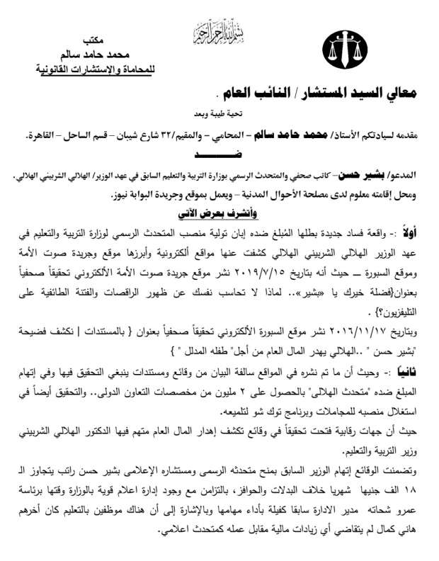 البلاغ الذي حمل رقم 12368 لسنة 2019 عرائض النائب العام، ذكر أنَّ وزير التربية والتعليم
