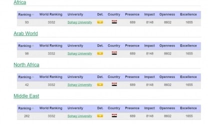 جامعة سوهاج، إن الجامعة احتلت المركز 93 على مستوى الجامعات الأفريقية والمركز 98 على مستوى الجامعات العربية، مما يعكس مدى نجاحها كمؤسسة تعليمية عريقة في الوسط الأكاديمي وتحديدا بين الأساتذة والباحثين، وقدرتها علي إنتاج