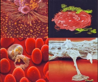 1- A microphage magnified 18,000 times engulfing droplets of oil.<a name=\'more\'></a> 2- a t-cell, a factor in the immune system, under attack by HIV (blue). 3- A b-cell. These cells produce antibodies that fight off specific infections. 4- Malaria protozoa bursting out of red blood cells. 5- Skin tissue and a blood clot. 6- Known as phagocytosis or "cell-eating," a microphage extends its pseudopods to ensnare and devour e-coli cells. 7- Bacteria trapped in a microphage membrane. 8- Bacteria trapped inside of a microphage will be destroyed by powerful chemicals. 9- A microphage reaches out for a bacteria. 10- A microphage engulfs a particle of asbestos. The microphage will likely die from trying to envelope this indigestible material. 11- T-cells attacking a cancerous cell. 12- T-cells killing a cancerous cell by breaking down its membrane. 13- The remains of a cancerous cell after it has been killed by t-cells. 14- What an allergic reaction looks like. 15- Autoimmune disease from the surgically removed femur of a woman. 16- The common chttps://archive.janatna.com/