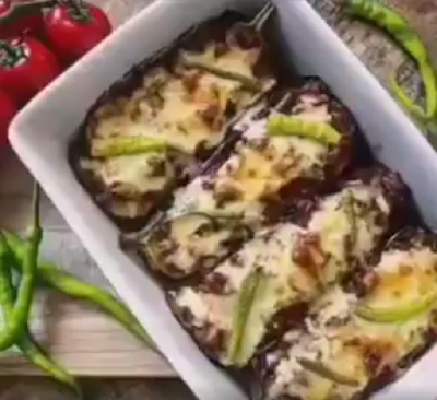 طريقة التحضير:اقطع الباذنجان إلى نصفين واتركهما في ماء مالح لمدة نصف ساعة.