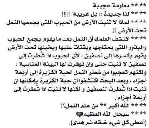 معلومة عجيبه وغريبة لماذا_لا_تنبت_الارض☜ من الحبوب اللتي☜ يجمعها النمل تحت الأرض !! <a name=\'more\'></a>┈┉┅━❀ ❀━┅┉┈☜- اكتشف العلماء أن النمل ☜بعدما يقوم بجمع الحبوب ☜والبذور اللتي ☜يحتاجها ويقتات عليها ويخبئها تحت الارض ☜يقوم بكسرها إلى نصفين ،☜ لان الحبوب اذا شُطرت☜ إلى نصفين لا تنبت حتى وان☜ توفرت لها البيئة المناسبة ، ☜ولكنهم تعجبوا ☜من شطر النمل لحبة الكزبرة إلى أربعة أجزاء ، ┈┉┅━❀ ❀━┅┉┈☜وبعد البحث اكتشفوا ☜ان حبة الكزبرة ☜بإمكانها ☜ان تنبت اذا ☜شُطرت لنصفين ☜ولكنها لا تنبت اذا شُطرت ☜إلى اربعة أجزاء .☜سبحان الله العظيم