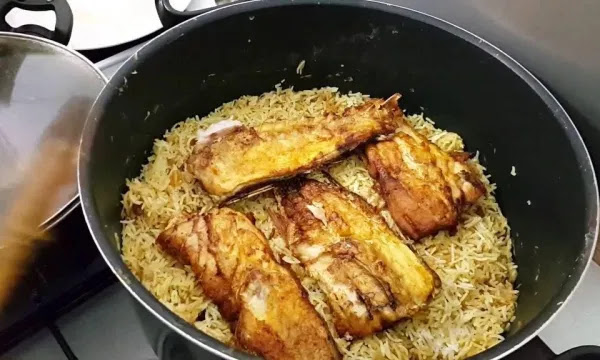 - أضيفي الماء الساخن والسمك إلى القدر وانتظري حتى تغلي المكونات ثم أضيفي الأرز وخففي النار حتى ينضج.
